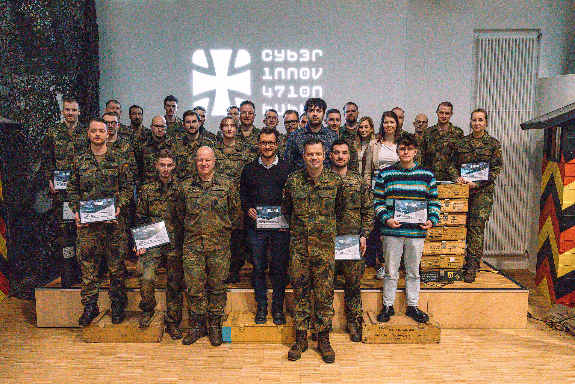 Innovation Challenges are a tried and tested format of the CIHBw for finding ideas from the troops, for the troops with the troops and developing them into innovation projects. Whether it's an AI location generator, disposable sensors or an app for MED training: under the motto "Explore the Unexplored", the Bundeswehr Cyber Innovation Hub worked with the army reconnaissance units to find innovative ideas from the troops. The CIHBw received over 90 ideas. The eight best proposals were presented to a group of experts from the Bundeswehr and civilian start-up entrepreneurs at our Demo Day in Berlin at the end of February 2024. There was also the opportunity to find sponsors for your ideas.
