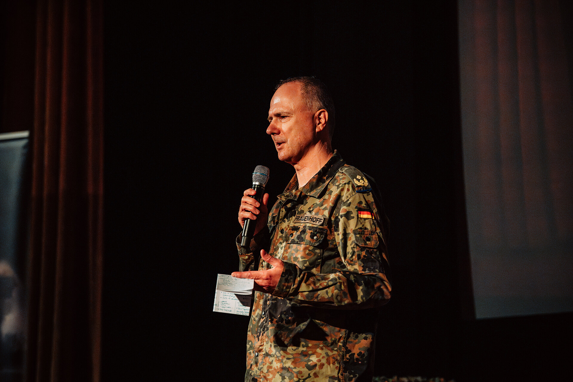 Der SDD Sprint ist ein Format des CIHBw mit dem Ziel, nutzungsnahe und wirkungsorientierte Digitalisierungslösungen aus der Truppe heraus zu entwickeln. Der Fokus liegt auf schneller Pretotypisierung, enger Einbindung der Nutzerperspektive und einem iterativen Vorgehen – orientiert an Methoden aus der zivilen Innovationspraxis. In seiner Keynote betonte Generalmajor Klaus Frauenhoff die strategische Bedeutung solcher Innovationsformate: „Innovation ist Überlebensfähigkeit. Wenn wir nicht adaptieren können, verlieren wir.“ Und er appellierte an die Truppe: „Wir dürfen Innovation nicht als Konkurrenz sehen. Wie müssen ihr offener begegnen. Der Sprint ist ein Format, das dazu beiträgt.“